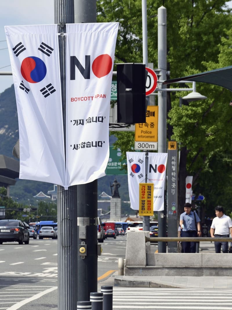 中区は5日、日本が「ホワイト国(優遇対象国)」からの韓国除外を決定したことに抗議するとして「NO ボイコット日本」と書かれ、不買や日本旅行の取りやめを呼び掛ける旗を1100本設置すると発表。6日に一部を設置した。